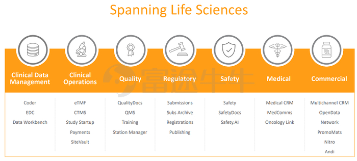 Veeva先是提供用于销售市场的客户关系管理CRM软件。紧接着,Veeva将其产品和服务扩展到客户研究运营、临床数据管理、临床运营、法规要求等各方面。随着产品种类的增加,其覆盖能力进一步增强了自身实力。这家公司真正地在主导这一市场,并为市场创造出一个巨大的发展空间。