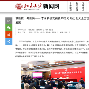 3月3日,北京大学发布获10亿元个人捐赠消息。其官网显示,李永新校友和他创建的北京中公公益基金会在此前已经捐赠1亿8千万的基础上,再次捐赠10亿元,设立北京大学中公教育发展基金,全面支持北大学科建设、教学科研、师资队伍和人才培养等各方面的发展。