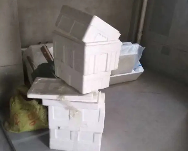 屋子里放置了塑料桶、纸壳箱、编织袋、泡沫箱等不少物品,还放了扫把和水桶等清扫工具。经了解,这是小区物业的一名保洁人员所堆放的。