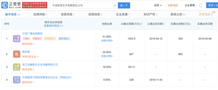 企查查APP显示,宁波影视艺术有限责任公司成立于2010年,法定代表人为陈三俊,注册资本为2850万元人民币,经营范围包含:专题、专栏、综艺、动画片、广播剧、电视剧的制作、复制、发行(在许可证有效期内经营)。影视策划、投资;广告服务等。企查查股权穿透显示,宁波影视艺术有限责任公司大股东为宁波广播电视集团,持股51%。
