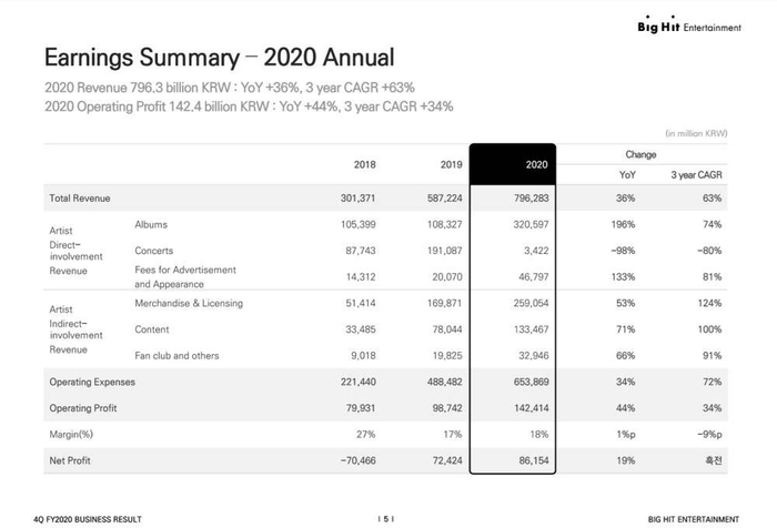 事实上,受到全球冠状肺炎疫情的冲击,Big Hit娱乐旗下艺人线下演出被大规模取消。而此项原本是2019年度Big Hit娱乐最重要的收入来源,仅此一项就在2020年下降了98%,据推测演唱会相关损失高达2000亿韩元(约合人民币11.6亿元)。