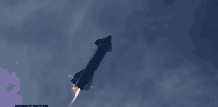 之后,SN10在空中又一次翻转,将姿态从水平调整为着陆前的竖直状态。