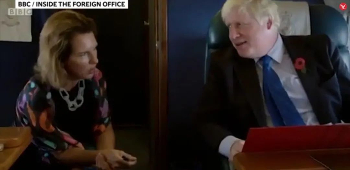 2018年,从里斯本到巴黎的飞机上,时任英国外交部欧洲司司长的吴若兰与当时还是英国外交大臣的鲍里斯·约翰逊进行工作交流。吴若兰微微蹙眉倾听,右手执笔,反复确认对话中的关键信息。