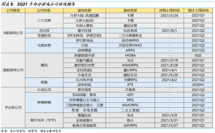 2Q21平台型公司:预计多款新游上线将拉动平台的活跃用户增长,如:心动公司,哔哩哔哩。