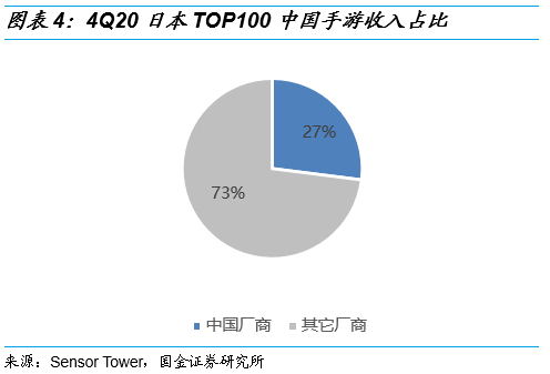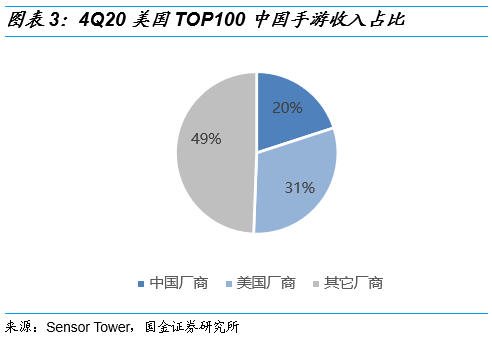 中国成为美/日手游市场最大进口国,市场份额接近本土厂商。据Sensor Tower数据,4Q20共有21款中国手游入围美区畅销榜Top100,营收7.8亿美元,占总市场份额20%,仅次于美国本土厂商的30.6%。日本市场方面,2020年中国手游营收同比增长81%,累计吸金28亿美元,4Q20占日本手游市场份额27%,《原神》、《荒野行动》等品质作品长期占据各畅销榜前10。凭借手游研发及运营的经验积累及海外市场的积极布局,中国出厂商的头部游戏成功率已超越任天堂、世嘉等本土企业,成为中国手游数字文化新出海的代表。