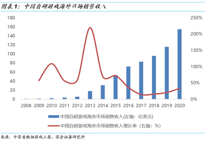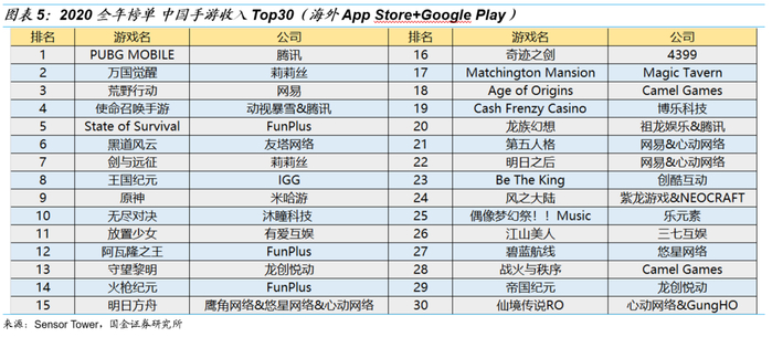 据中国音数协游戏工委,2020年中国自研游戏海外销售总额达154.5亿美元,同比增长33.3%,手游已成为中国 “文化出海”主要“新载体”。2020年,疫情催生海内外数字经济全面提速,游戏作为中国数字产业一大引擎,全面助力中国文化新出海,提高全球数字文化影响力。据Sensor Tower数据,2020年有37款中国手游在海外营收超1亿美元,同比增长48%,Top30手游在App Store和Google Play累计吸金92.4亿美元,同比增长达47%,彰显中国游戏厂积极海布局成果,吹响新时代游戏出海号角。