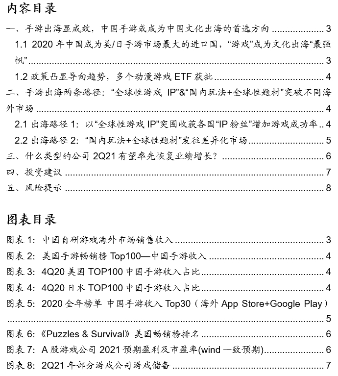 二、手游出海两条路径:“全球性游戏IP”&“国内玩法+全球性题材”突破不同市场。1) 以“全球性游戏IP”突围收获各国“IP粉丝”增加游戏成功率。全球性游戏IP具有原用户基础与市场知名度,将吸引原玩家与移动游戏用户,国内大厂可利用技术与运营优势与IP方合作进行手游移植。腾讯:“端转手”《英雄联盟》、《使命召唤》等爆款产品密集上线,助推21年利润释放。2) “国内玩法+全球性题材”发往差异化市场。三七互娱:以“SLG+三消”玩法+“全球性题材”突破海外市场。《Puzzles & Survival》在市场中已成功作品《E&P》基础上迭代微创新,进行玩法优化及题材迭代,迅速取得成功,最高已升至美国IOS畅销榜第34名,预计未来通过“国内玩法+全球性题材”持续迭代的方式能够继续在海外市场取得突破。网易:《哈利波特:魔法觉醒》等全球性影视题材改编手游加上国内玩法未来有望在海外市场取得亮眼成绩。