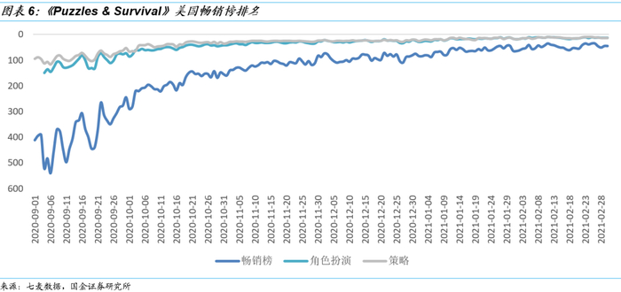 对已取得成功的产品以“国内玩法+全球性题材”进行迭代微创新,不断适应海外不同地区用户偏好,成为出海新策略。 “国内玩法+全球性题材”的出海方式以三七互娱为例,在市场上成功的“SLG+三消”游戏《E&P》基础上,三七互娱进行产品迭代与微创新,推出了同类型游戏《Puzzles & Survival》。《Puzzles & Survival》在玩法上与《E&P》相似,成熟的玩法加以微创新的全球性题材提高了其游戏产品《P&S》在海外成功率。《Puzzles & Survival》上升势头迅猛,根据七麦数据,2020年9月突破美国IOS畅销榜500名后快速上升,12月末达80名,截至21年3月1日,《Puzzles & Survival》最高已达畅销榜34名。除了全球性游戏IP外,全球性的影视动漫题材也为游戏改编提供了丰富的资源库,如网易的《哈利波特:魔法觉醒》、《漫威超级战争》等将受益于全球粉丝效应,《游戏王:决斗链接》、《魔法禁书目录》则吸引了相关二次元忠实玩家。