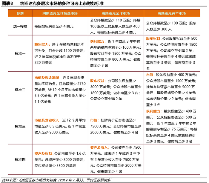 如今新三板内部转板和精选层升板机制已经完成,未来我国转板机制可能在降板和同级转换方面有所突破。2021年2月26日,证监会正式发布《全国中小企业股份转让系统挂牌公司转板上市监管指引》,沪深交易所正式发布《转板上市办法》,明确转板上市各项制度安排,规范转板上市行为。转板范围限制于科创板和创业板;转板上市条件包括“连续挂牌一年以上”、“股东人数不低于1000人”、“股本总额不低于3000万元”“董事会审议转板上市相关事宜决议公告日前六十个交易日内累计成交量不低于1000万股”;转板程序方面,无需经证监会核准或注册,由交易所审批决定。借鉴美股市场经验,未来我国转板机制将不仅限于低层次市场向高层析市场转板,还会包括高层次向底层次、交易所之间和交易所内部的转板。
