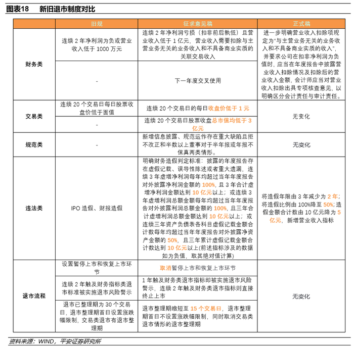 相较于征求意见稿,正式稿在财务造假方面做出进一步优化。正式稿将造假年限由3年减少为2年,造假比例由100%降至50%,造假金额合计数由10亿元降为5亿元,同时在原先净利润、利润总额和资产负债表的基础上新增营业收入指标。需要注意的是,退市并非打击造假的唯一方式,上交所也表示“打击造假需要综合体系、多种工具共同发挥作用,根据造假的严重程度和实际情况,综合采取包括诚信档案、监管措施、行政处罚、移送刑事、集体诉讼等多种措施,而不是只要造假就退市”。