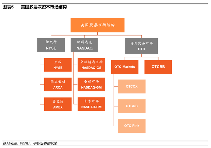 美股转板可分为升级转板、降级转板、平级转板和内部转板四类。升级转板指从场外市场转至具有“国家证券交易所”牌照的交易所上市;降级转板指从国家证券交易所转至场外市场;平级转板指不同交易所之间的转板;内部转板包括纳斯达克内部三个板块之间的转板、同属于纽交所泛欧集团板块之间的转板、以及在OTC Markets中从较低层次的OTCPink板块升级到OTCQX和OTCQB板块。