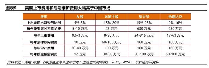 另外,美股注册制背景下IPO门槛较低,上市后维护费用较高,整体来看退市成本低。一方面,美国IPO采用注册制,适用多套财务条件,予以企业较大的选择权。近5年美国每年IPO数量都在300家以上,2020年由于SPAC上市的火爆达到746家。从上市流程来看,美股上市公司从申报到注册平均用时3-5个月不等,上市效率较高。另一方面,美股上市公司每年需要支付较高的后期维护费用,例如每年投资者关系维护费约为630万元,信息披露费用约为50-100万元,审计费用在160万元左右,大幅高于我国的5-10万元、12万元和30-40万元,上市公司维持上市的成本较高,一定程度上也提高了企业对于退市的容忍度。