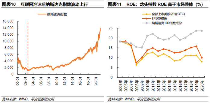另一方面,互联网泡沫加快尾部公司出清,头部公司快速崛起。纳斯达克指数在2002年10月达到最低点1108后波动上行,截至2021年2月末累计上涨近11倍。龙头公司的优势也愈发显著,2005年以来标普500指数ROE均高于市场整体,纳斯达克100指数年均ROE达到近20%,显著高于整体的11.5%。