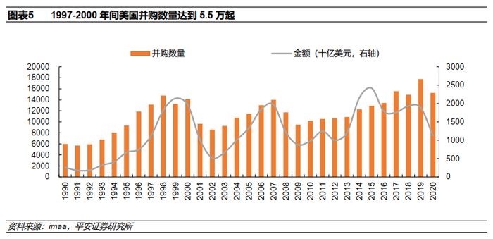 期间龙头公司通过并购重组扩大市场优势,互联网泡沫后头部公司优势渐显,龙头指数ROE高于整体水平。一方面,上市公司通过并购重组整合业务,1998-2001年间,并购退市公司数量占比平均为7.7%,达到历史最高点。期间并购重组更多的是强强联合的战略性横向并购,例如,1996年12月,波音公司以133亿美元并购麦道公司,并购后波音成为占世界民用客机75%市场份额的最大飞机制造商;1998年3月,花旗银行与旅行者集团公司合并成为世界上最大的金融服务公司,交易金额高达830亿美元。