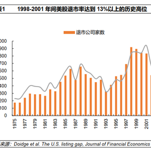 1998-2001年亚洲金融危机和互联网泡沫时期美股上市公司退市率达到13%以上。1992-1996年间,在政策鼓励创新型企业上市融资的背景下,大量未盈利的中小科技型企业上市融资,期间美股新上市公司数量占比均在10%以上。亚洲危机爆发和互联网泡沫破裂后美股退市率升值历史最高位,1998-2001年间年均退市率达到13%以上。