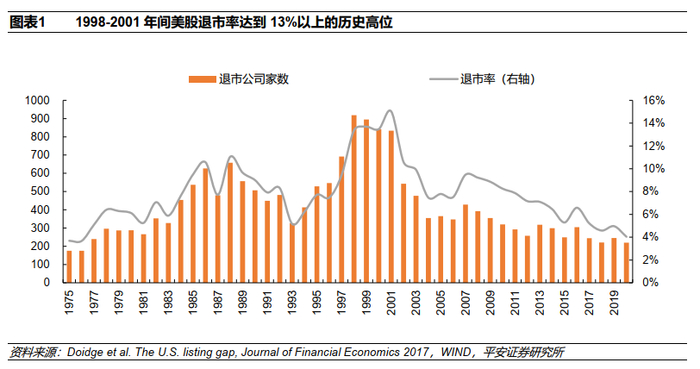 美股退市集中在亚洲危机和互联网泡沫期间。从美股市场的历史退市率来看,美股三大交易所退市率在1998-2001年期间达到历史最高,退市率在13%以上,2001年互联网泡沫期间达到最高值15%。近年来美股退市率逐年下滑,2020年为4%。