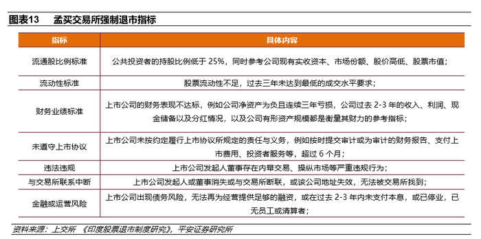 第二,印度退市成本高,退市后10年无法重新上市。其一,印度上市公司被强制退市后,该上市公司的董事、发起人以及他们所发起成立的所有公司,在10年内都不得以直接或间接方式进入证券市场或申请重新上市。其二,公司和托管人不得通过出售、质押等方式进行转让。其三,冻结发起人持有的任何股权和公司利益,如股息、权利、红利、分割等,直至向公众股东提供退出机会;其四,董事及发起人不得在向公众投资者提供退出机会前担任其他上市公司董事。
