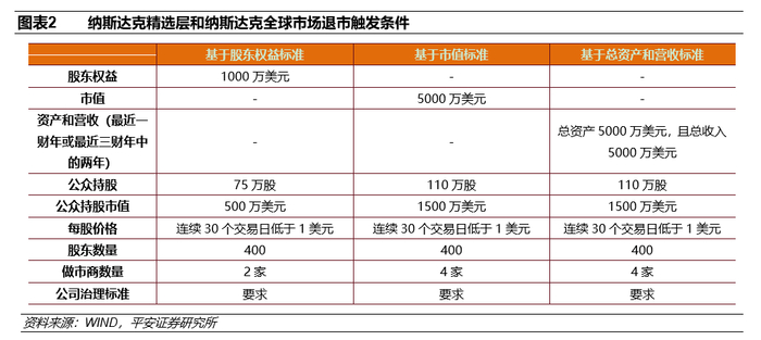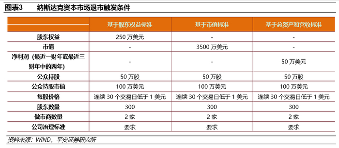 第二,美股的转板机制也为退市提供了更为多元的渠道,为退市企业提供心理“缓冲垫”和继续交易的机会。美股市场按照公司的上市标准、公司规模和市场的开放程度大致可分为三层:第一层次是由纽交所、纳斯达克全球精选层和纳斯达克全球市场组成的全国性市场,主要面向跨国的大型企业;第二层是由全美证券交易所和纳斯达克资本市场构成的全国性市场,主要面向高科技企业和中小企业;第三层由OTCBB和OTC Markets构成,主要是面向美国小型公司的场外市场,其中OTC Markets由高到低进一步分为OTCQX,OTCQB和OTCPink三个市场,OTCQX为精选板,有财务准入要求和较高信息披露要求,其次是OTCQB,财务要求相对较低,也需要满足信息披露要求,OTCPink无财务要求和信息披露要求。其次,转板退市为公司提供了继续交易的机会,研究表明,美股股票一旦退市,价格平均折损一半,交易成本上升三倍,但是波动性也会翻倍,从主板退市至场外市场的公司依然能够享受活跃的交易。