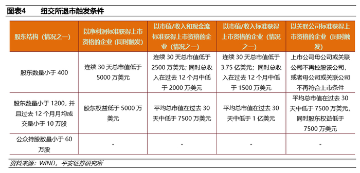 第一,美股退市制度量化指标占比高,重视市场影响力,退市流程精简可操作性强。退市标准方面,美国量化指标占比较高,纳斯达克和纽交所的退市触发条件均对公众持股数量、公众持股市值、市值和盈利能力等指标设置了量化约束,整体来看重视上市公司的影响力。退市流程方面,美国退市流程精简,无暂停上市和恢复上市环节,但给予企业复核申请的权利。