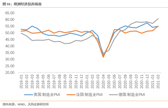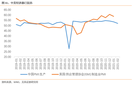 中美两国经济逐步复苏。得益于国内疫情良好控制,国内PMI在2020年2月触底后提前出线反弹;美国的制造业PMI在复工后逐步上行,拜登的1.9万亿美元财政刺激政策有望实施,经济复苏可能超出市场预期。