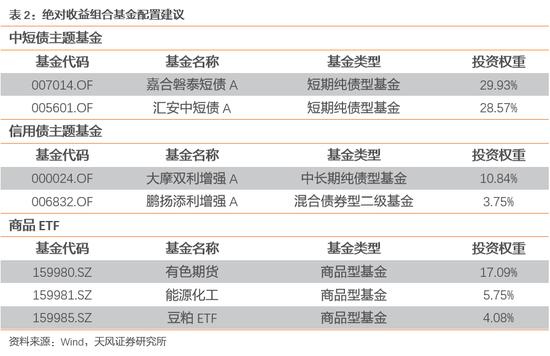 根据最新的仓位配置,我们分别在中短债主题基金、信用债主题基金以及商品ETF中结合基金规模、Alpha、风险指标等维度筛选相应基金。基金推荐名单以及相应的权重配置建议如下。
