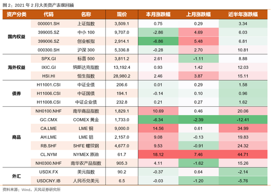 2月份,市场冲高回落,春节前后风格逆转,节前核心资产与赛道股继续拉升,节后中小市值滞涨股与周期金融占优。春节之前,市场延续1月份核心资产的凌厉上涨行情,并进一步极致化;2.1-2.10日,全市场39%个股上涨(61%个股下跌),中位数涨幅-1.8%,但沪深300上涨了8.5%,创业板指上涨了9.1%。春节之后,风格方面和年前相比,出现了较明显的变化;2.18-2.26日,全市场79%个股上涨(21%个股下跌),中位数涨幅+5.1%,但沪深300下跌了8.1%,创业板指连续7个交易日下跌,累计跌幅达14.6%。春节之后,核心蓝筹遭到持续的抛压,相应地中小市值、低位低估的标的开始企稳,市场的涨幅分布与指数的涨幅分化也从一个极端到另一个极端。