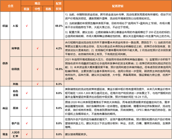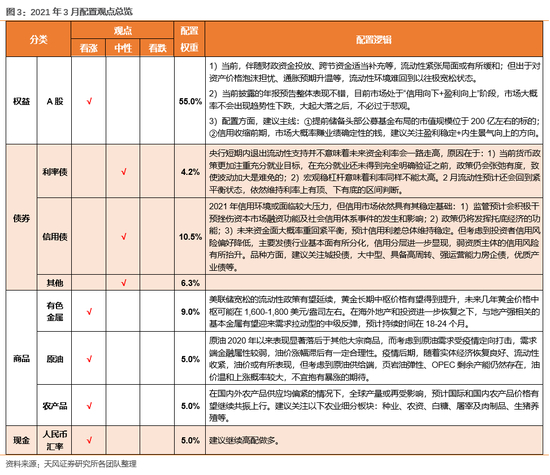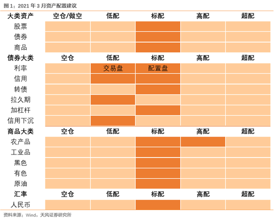 当前的经济增长和通胀状态处于复苏赶顶阶段,类似2013年上半年与2017年上半年;经济环比增速和通胀水平(PPI)预计在二季度先后见顶回落。中期的流动性环境仍然是紧平衡,信用周期预计平稳收缩至3月斜率转陡。建议仓位上继续标配权益,低配(交易盘)或标配(配置盘)利率债、标配或低配信用债(中高等级信用债),标配转债。标配工业品、标配或高配农产品,标配或高配做多人民币汇率的交易策略。建议仓位:权益(55%)>债券(21%)>商品(19%)>现金(5%)。