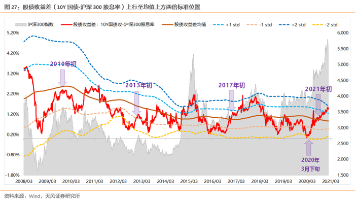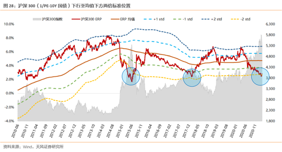 第二点是估值水平(结构)的变化。我们跟踪的一个比较有效的指标,股债收益差(10Y国债收益率-沪深300股息率),这一指标从去年四季度的历史均值水平,一路上行至目前的均值上方两倍标准差的位置,基本上达到了历史相对极限的区域,已经接近2015年初、2018年初的位置。另一个估值指标是指数的ERP,其结论也类似。