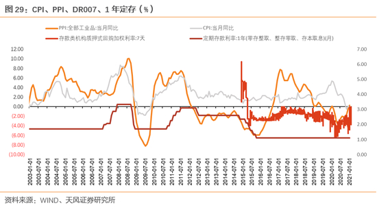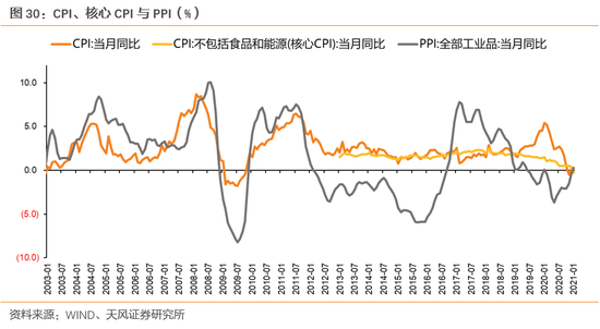 对于国内,从央行操作和CPI同比关系的历史经验来看,2015年之前CPI是央行重点关注的通胀指标。当CPI同比高于1年期定存利率后,央行货币政策会收紧,反之亦然,也就是说央行有意维持着1年期定存实际零利率。2009年1季度的《货币政策执行报告》中也明确指出:“衡量一个国家通货膨胀或通货紧缩的指标有很多,如居民消费价格指数(CPI),生产价格指数(PPI)和GDP缩减指数等。其中,最常用的是CPI。”