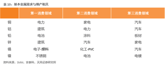 铜、铝、锌三种最重要的基本金属的需求均与地产和基建息息相关。三者的前三消费领域都集中在电力/建筑/家电和汽车四个领域。电力和建筑本身就是地产和基建,而家电和汽车的消费则与地产相关性较强。铜、铝、锌在电力和基建中的应用都偏向于竣工前后,家电汽车的消费也集中在竣工前后,因此地产后周期属性较强。