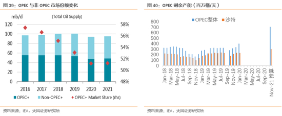 由于美国在2020年页岩油大幅减产后,预计2021年产量可能出现再度下降,OPEC+的市场份额在2016年持续下降后,2021年有望恢复。沙特在1月OPEC+会议上决定在接下来的两个月超额减产100万桶/天。沙特的考虑除了基于当前冬春季节疫情对需求的影响之外,还出于对页岩油产量短期难以反弹、进而对保有自身市场份额的底气。