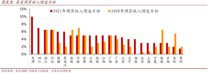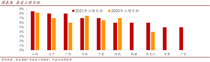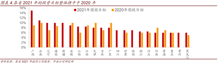 各省2021年的投资目标整体持平于2020年目标,平均在8%左右,但由于去年我国固定资产投资同比增长2.9%,2019年增长5.4%,因此去除了基数之后今年各省市对于投资的目标实际较2020年是调低的。投资增速目标的下调其实也显示了随着我国经济逐渐回到正轨,今年政府维稳经济的意愿较去年肯定是有所下降的。分省市来看,仅广西、辽宁较大幅度地上调了今年的目标,多数省份投资目标基本持平或低于去年的目标,天津、广东、河南投资目标较去年有明显的下调。