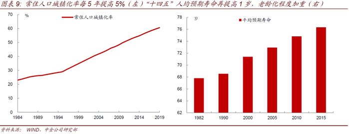 十四五规划共有5个主要目标,经济运行保持在合理区间,常住人口城镇化率提高到65%,人均预期寿命再提高1岁,城镇调查失业率控制在5.5%以内,基本养老保险参保率提高到95%。前两个对经济影响较大,这意味着按人均住房面积30平米计算,到2025年城镇化会带来4.2亿平米/年的住房销售,相比目前每年的17亿平米/年,由于更新需求逐渐下降,住房销售的中枢可能有所下降,带来经济增速中枢的下降。