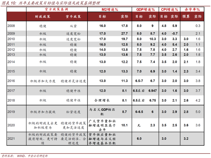 (2)2021年居民消费价格涨幅目标定为3 %左右。CPI目标定为3%左右,与历史上基本一致。当然过去10年CPI 都没有实现3%的目标,由于猪肉下行周期的拖累,我们预测今年CPI在1.5%左右。今年PPI的压力可能存在,商品价格会对货币政策造成一定的扰动,但也不是决定性因素。