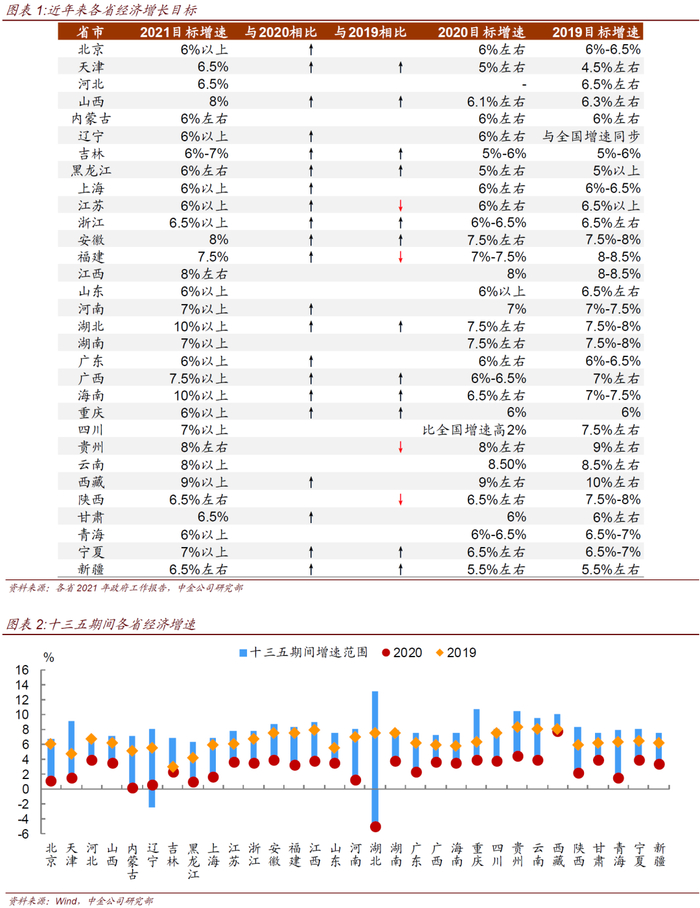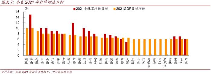 其中,北京、上海、江苏、浙江、广州、河南、湖北、云南、西藏等18个省份设定了最低目标增速。具体来看,北京、上海、江苏、山东、广东、重庆、辽宁、青海等8个省份将GDP目标增速设定在6%以上,浙江设定在6.5%以上,剩余9个省份最低目标增速则更高。其中,湖北和海南的目标增速均在10%以上。由于受疫情冲击最大,湖北省是去年唯一一个出现负增长(-5%)的省份,2021年的湖北省政府工作报告中提到“去年我省经济严重受创,今年要全力回归正常,不仅要把损失的部分补回来,还要力争把应有的增长追回来”、“考虑去年低基数因素和潜在增长率,把今年经济增长目标定在 10%以上,是积极进取的,也是有较强支撑的”。而海南的增速目标则与国家建设中国特色自贸港的规划相一致。