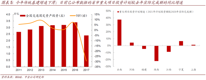 基建方面,今年传统基建增速可能会放缓,根据此前交通运输部公布的的投资计划,今年预计完成交通固定资产投资2.4万亿元左右,较2020年的3.42万亿元同比下滑30%左右。中央两会提出“加大5G网络和千兆光网建设力“,而各地对于新基建项目也都着墨较多,意味着“新基建”可能是今年各省在投资领域重点发力的方向。但“新基建”发力可能也难以对冲传统基建增速的下滑。目前各省市已陆续公布了今年的重大项目投资计划,由于各省的重点项目往往涵盖了传统的交通投资如铁路以及新基建的项目,因此我们可以对各省的整体基建投资情况作出大体的判断。目前已公布计划的省市投资计划较去年的实际完成额平均增长2%左右,这个力度也弱于去年全年基建投资3.4%的增速。