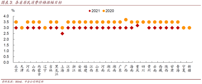 分省份来看,除上海(2.5%左右)、重庆(3.2%左右)、四川(3.5%左右)外,其余28个省份均将CPI目标设定在3%左右,略低于2020年整体3.5%的水平,与全国居民消费价格政府一致。