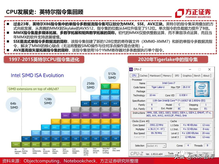 纵观CPU指令集的发展史,新指令集的 产生不会废除原有的指令集。指令集的 发展是采用叠加的方式进行的,以保证 整个系统的兼容性。例如第11代酷睿 Tigerlake比上代的Icelake,多了虚拟 化的VT-X指令集。