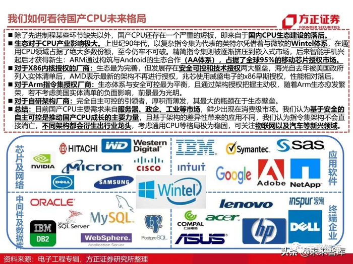 总结:目前国产CPU主要需求来自服务器、政企、工业等市场,鲜少出现在消费级市场。我们认为基于安全的自主可控是推动国产CPU成长的主要力量,且基于架构的差异性带来的应用不同,我们认为指令集架构不会直 接消亡,不同架构都会衍生出行业龙头,考虑通用CPU等格局极为稳固,可关注物联网以及汽车等新兴领域。