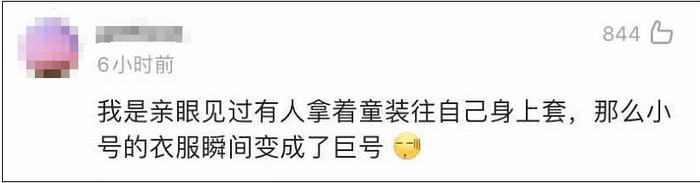 一位成都地区优衣库店员表示,最近确实很多成人来试穿童装。上述店员记得有的顾客为了试出看起来最贴身的衣服,从110到160尺码的,每个尺码都会拿一件。有170cm左右身高的女生拿着120号码的童装去试衣间,直接把衣服撑大了,衣服只能报废处理。
