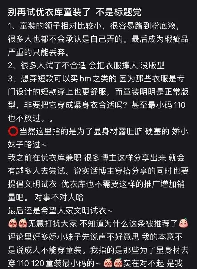 2020年4月就有人发帖建议大家不要再试穿优衣库童装,“容易蹭到粉底液,瑕疵品严重的只能丢弃,很多人试了不合适会把衣服撑大使其没有版型,喜欢短款可以买BM类型的衣服。建议大家不要为了显身材去穿110、120等童装里最小码的衣服。”