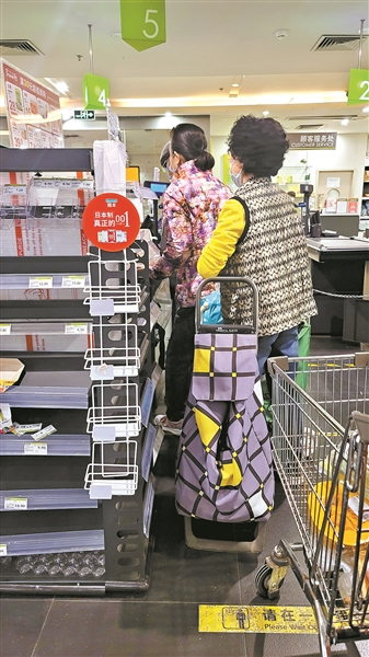 广州百佳永辉超市金田花苑分店里,一位顾客在货架上拿起所剩不多的货品。
