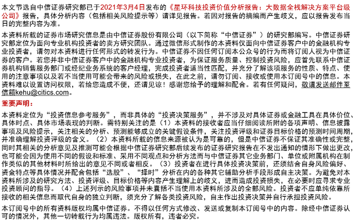 随着5G时代来临,数据量爆炸式增长、数据复杂度不断提高,人工智能等前沿技术的发展催生了对非结构化数据的强劲需求,从而推动全球大数据市场高速增长。在国产替代背景下,中国大数据厂商迎来结构性机遇。星环科技依托Hadoop生态不断迭代,在与云融合的趋势下持续展现生命力。此外,公司作为国内唯一覆盖数据库和大数据领域全栈解决方案的厂商,凭借市场稀缺性、核心技术自主可控、本地部署+云化并行战略、布局人工智能/数据科学等优势构建核心竞争力。参考Cloudera等美股大数据公司,我们给予公司2021E PS 20~25x的估值区间,建议投资者重点关注。