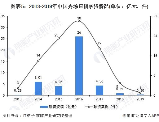 从资本市场来看,2013-2019年,中国秀场直播融资呈波动趋势,其中在2016年达到峰值,融资额达到26亿元,融资案例为30件。这与中国网络直播发展的走势基本相同,2016年为中国网络直播爆发元年,彼时,众多资本和玩家纷纷涌入该领域。