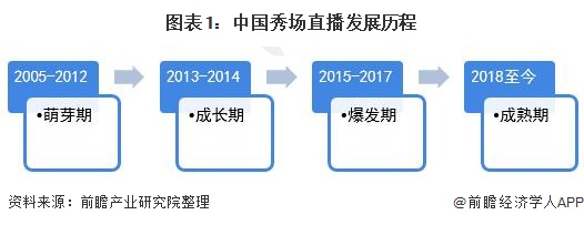 整体来看,我国秀场直播行业发展经历了4个阶段:2013年前的萌芽期、2013-2014年的成长期、2015-2017年的爆发期,2018年至今进入成熟期。
