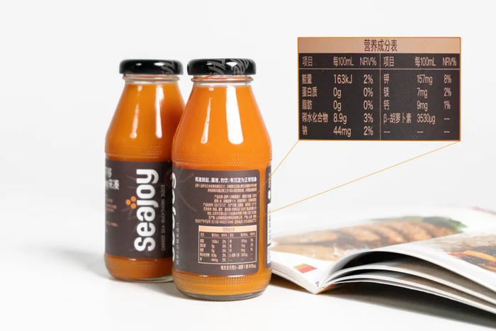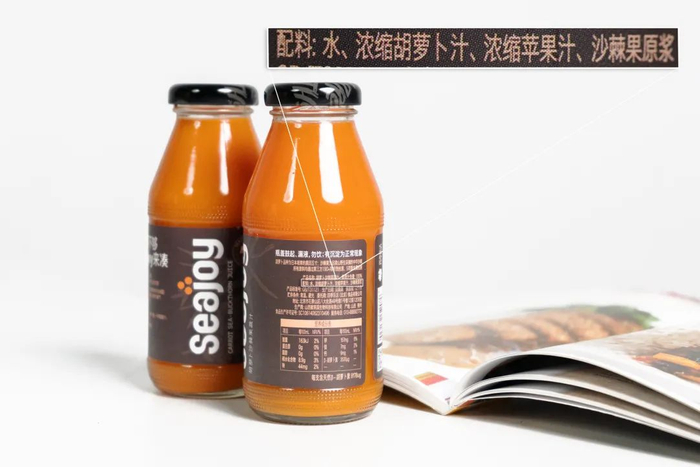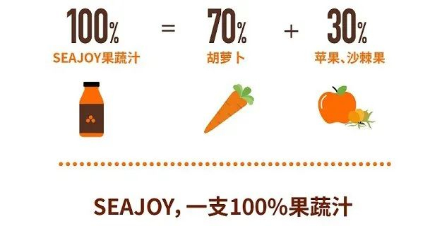 在配料表里,你会看到这款SEAJOY果蔬汁的主要成分只有水、胡萝卜和苹果浓缩汁与沙棘果原浆。