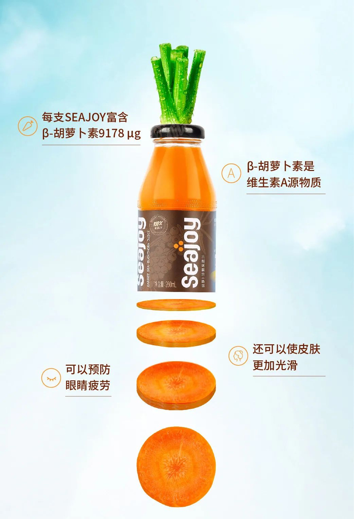 每支SEAJOY胡萝卜沙棘果蔬汁含有9178μg天然胡萝卜素,约等于三根胡萝卜的含量!常用电脑和手机的朋友多喝有利于保护眼睛和皮肤哦!