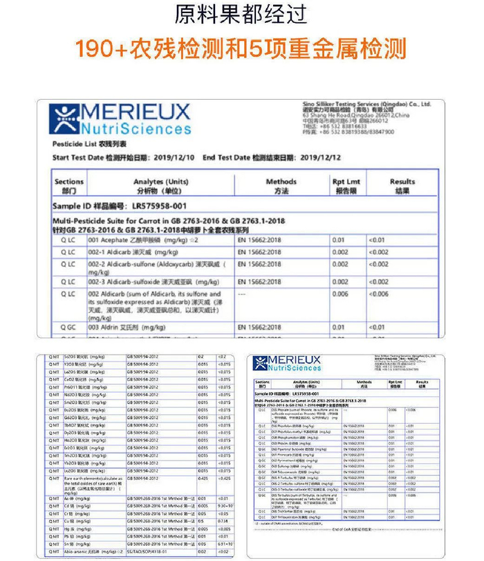 所有的原料果都通过了190+项农残检测和5项重金属检测,优质健康又安全。