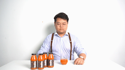 以0.5%为单位一点一点地调试胡萝卜汁、苹果汁和沙棘果汁比例,运用胡萝卜和苹果的甜味平衡沙棘果的酸味,才得到了现在手中的成品。