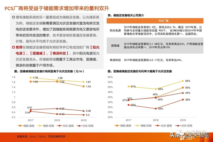 锂电储能系统的另一重要组成为储能逆变器,以光储系统为例,储能逆变器 除需要满足光伏逆变器对直流电转交流电的逆变要求外,增加了因储能系统既要充电又要放电所带来的双向变流的需求,技术壁垒相较普通逆变器更高,价格、盈利水平均高于光伏逆变器。